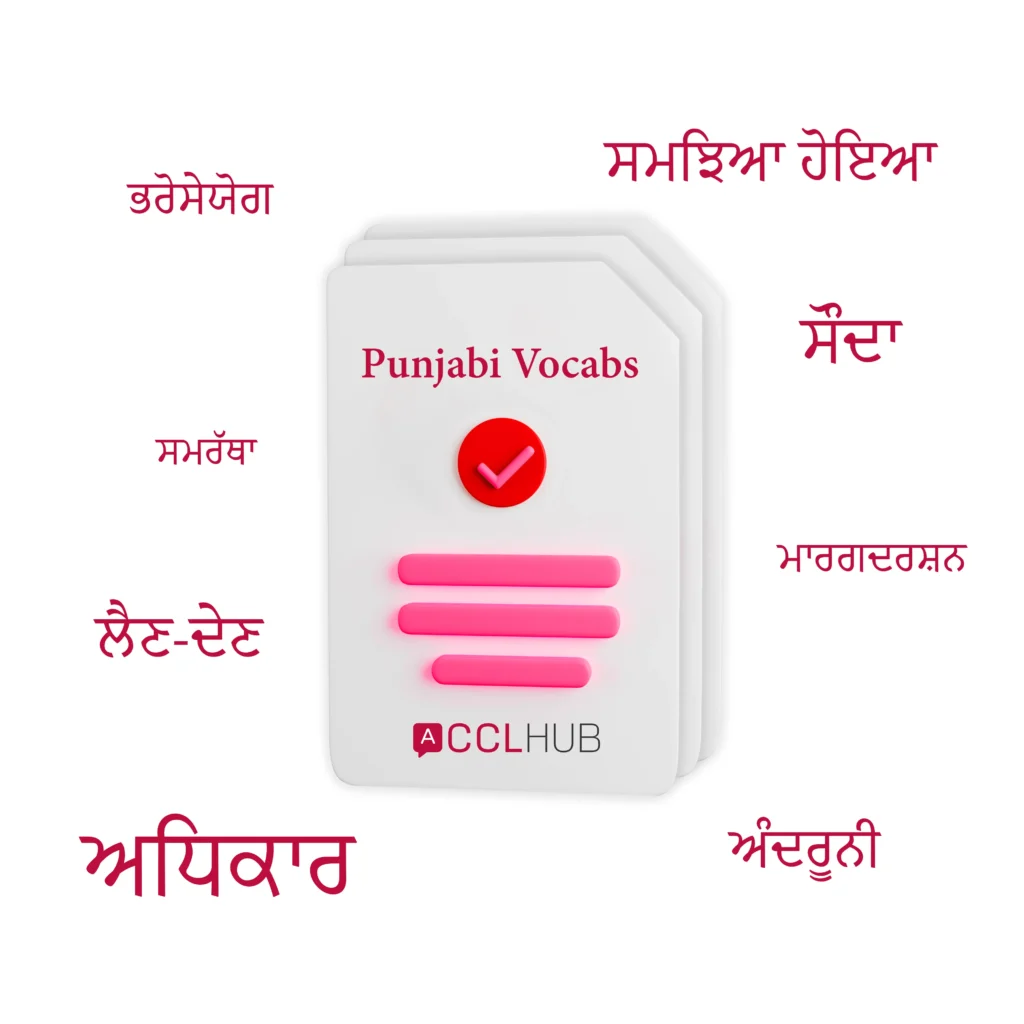 Master every essential Punjabi word and phrase used in real NAATI CCL dialogues with our comprehensive Punjabi vocabulary resource. This free English to Punjabi word list includes topic-wise translations, practical phrases, and exam-specific terminology designed for NAATI success.